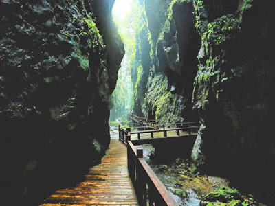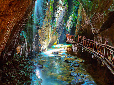 朝陽(yáng)地縫一線天景區(qū)位于張家界慈利縣趙家埡水庫(kù)底部,是一個(gè)外河流入型的水底大溶洞,洞高30—80m,寬道5—25m,全長(zhǎng)1550m,洞穴廊道呈峽谷狀態(tài),走向由南向北穿山而過(guò),落差80余米,形成于高山峰叢喀斯特峽谷流域,深切河床滲漏石灰?guī)r斷層層里裂隙,向含水層集中循環(huán),再經(jīng)溶蝕、侵蝕崩塌作用,形成與原河道平行的地下通道,是喀斯特區(qū)過(guò)境河的伏流河。